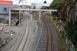 Viewed from the new road bridge, the live Down Main runs alongside the almost fully excavated trench for two other tracks, with the fourth splitting off on the other side of the bridge. With the closure of the temporary bridge and part of Mt Eden Road, it's no longer possible to view work in the rail corridor between these locations