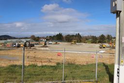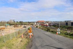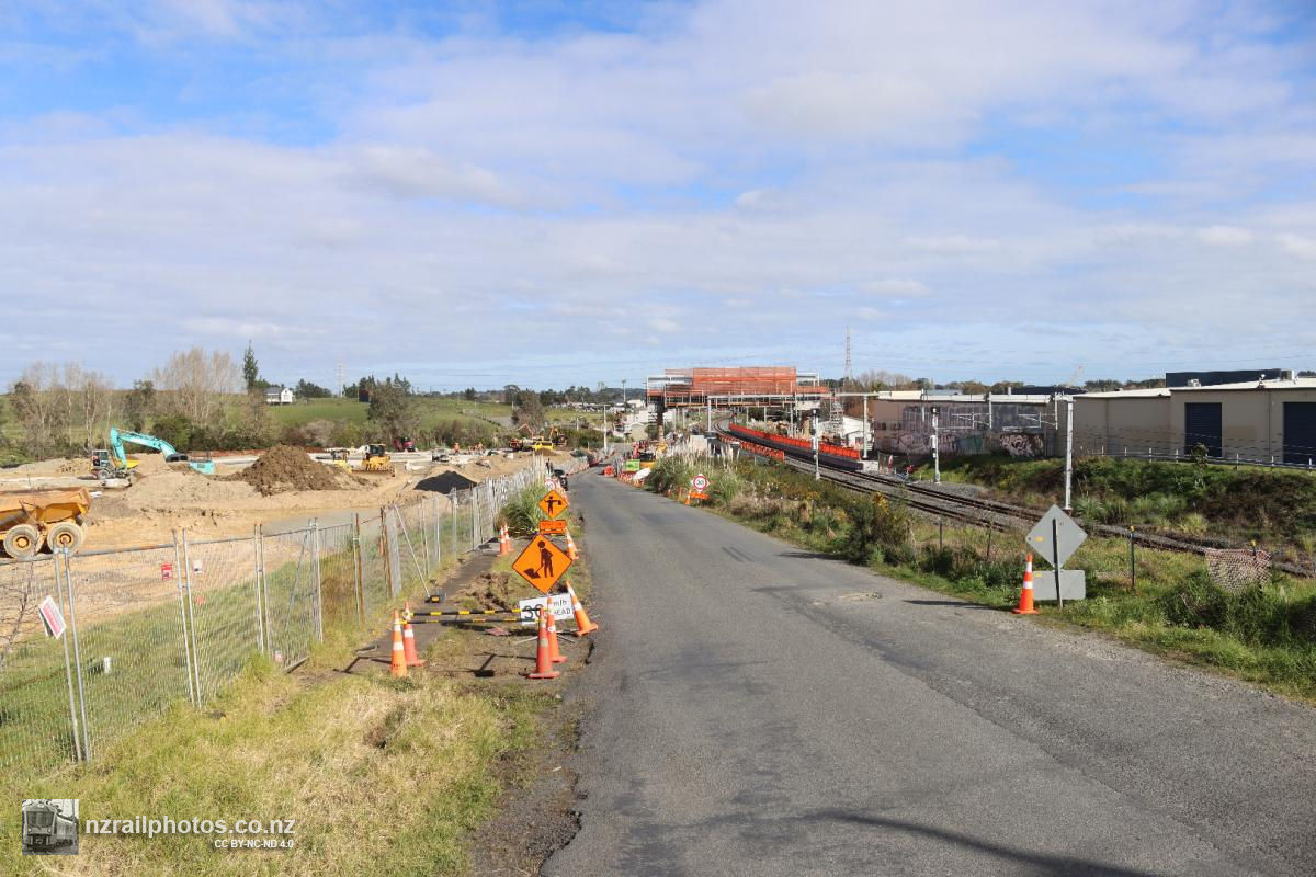 An overview of the station construction site, with the platform on the far right. A bus layover is set to be constructed in place of Flanagan Road at this position, with a park and ride occupying the land where the green house is located - a second house behind has already been demolished