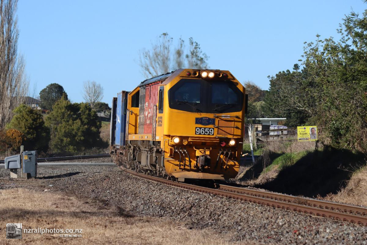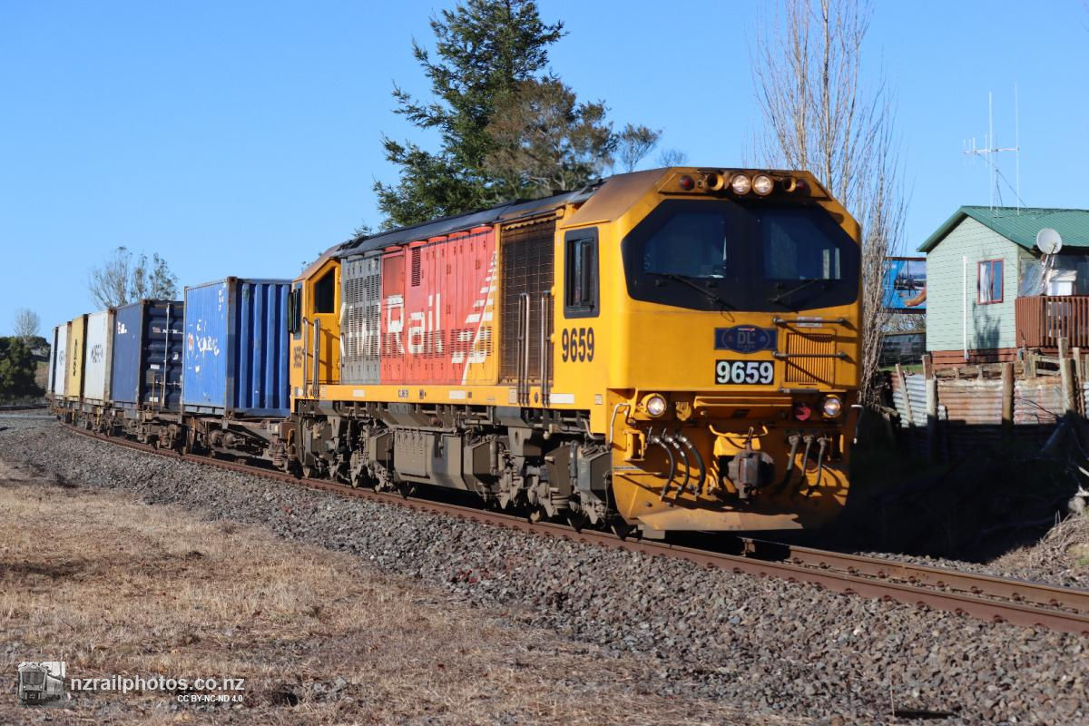 In poor weather, DL 9014 leads train 138 up the grade through Pokeno. With recent severe weather causing flooding and slips across the Auckland network, train services north of Hamilton (including Te Huia and Auckland metro) have been impacted, with this train being the first of the day through Pokeno