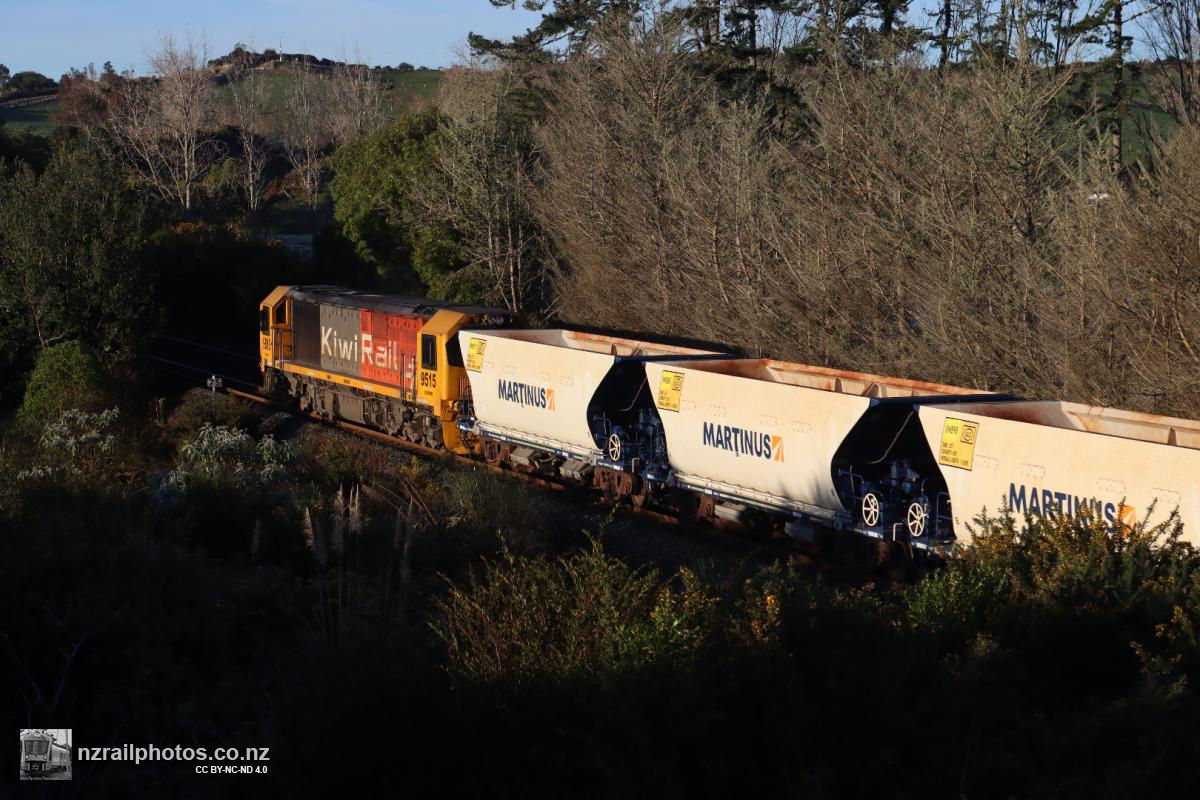 DL 9515 brings train 138 up the grade through Pōkeno, with the Martinus ballast wagons, classified XMB, in tow. The wagons are returning to Glenbrook after spending some time in the South Island doing nothing, originally arriving there in September 2023 just before the iReX project was cancelled