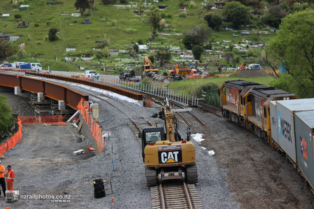 Trains MP5 and MP6 on their journeys to and from Auckland, and bridge works at Taupiri