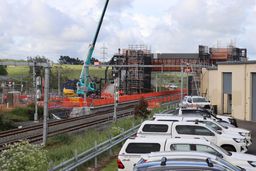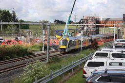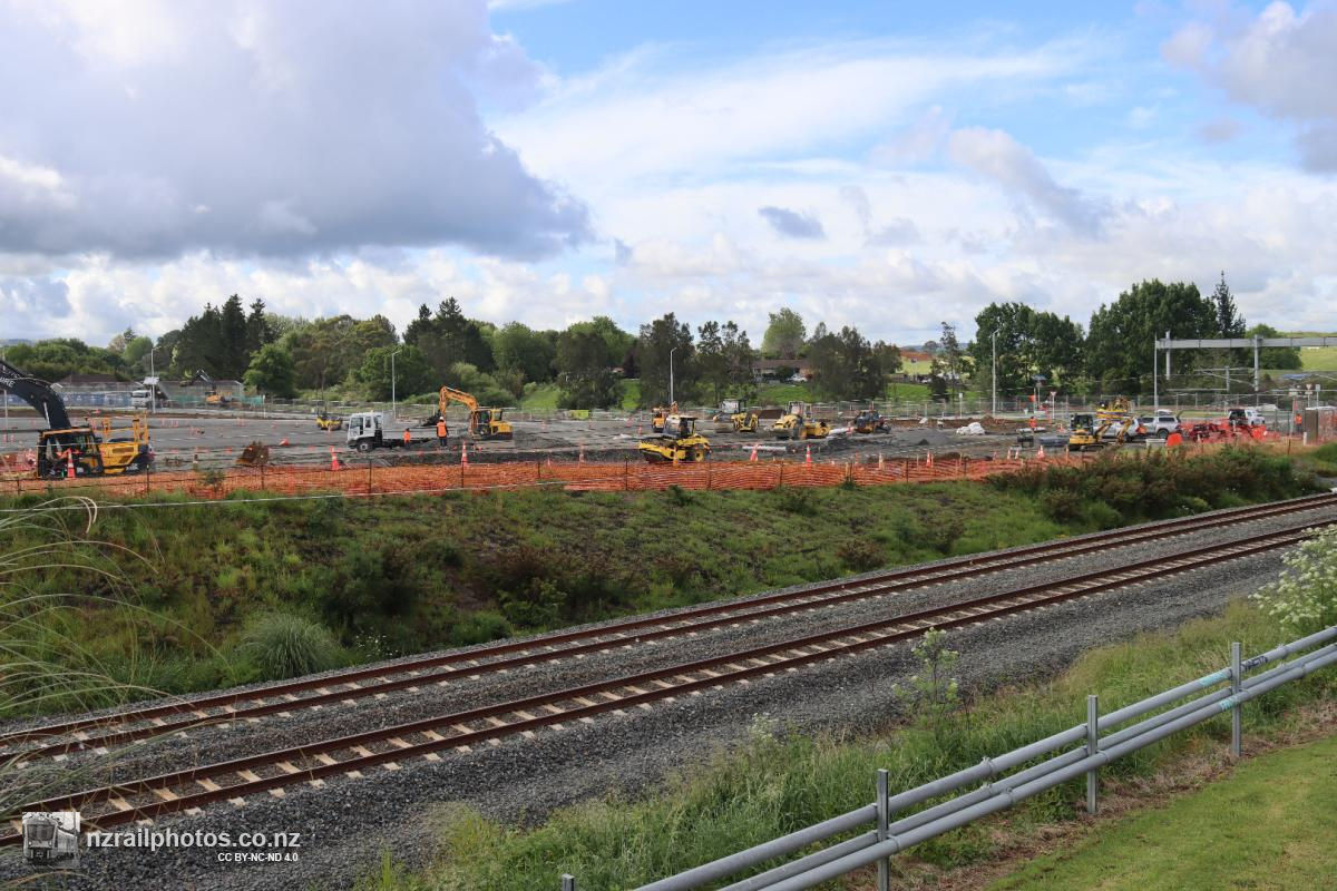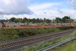 An overview of the station construction site, with the platform on the far right. A bus layover is set to be constructed in place of Flanagan Road at this position, with a park and ride occupying the land where the green house is located - a second house behind has already been demolished