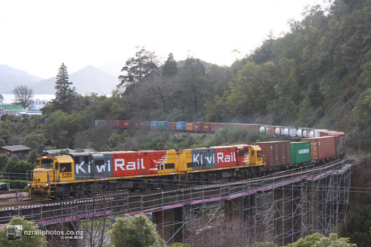 Train 725 heading across the Waitohi Viaduct, and a quick look at the road bridging operation at Picton